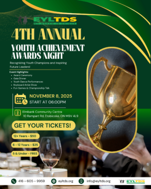 Join us for the 4th Annual Youth Achievement Awards Night on November 8, 2025, at Elmbank Community Centre, Etobicoke. This inspiring evening will celebrate youth champions with an award ceremony, gala dinner, dance and music performances, and engaging activities. Don’t miss this chance to honor and encourage the leaders of tomorrow!